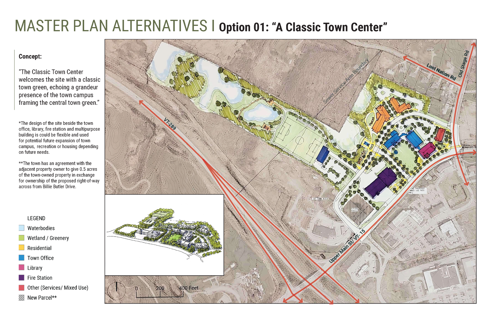 Following the purchase of 80/90 Upper Main Street in November 2023, the Selectboard was presented with the next steps and timeline for the future development of the parcels in January 2024. While it is anticipated that the 32-acre site will include municipal offices and a fire station, it still needs to be determined what other uses should be on the site, the timing of development, project costs and funding, utilities needed, and site layout. In order to determine these elements, an extensive planning process needs to occur. It is important to involve the public to make this a community-wide process and to gain the support for the development that Essex residents want to see at the center of their town.